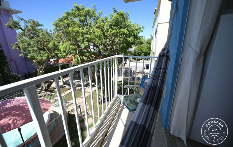 Aconchegante apartamento para até 3 pessoas com sacada voltada para a piscina, com rede e churrasqueira.