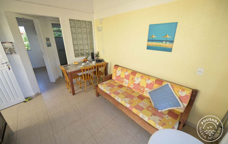 Sala com sofá (cama de solteiro) e cozinha conjugadas.