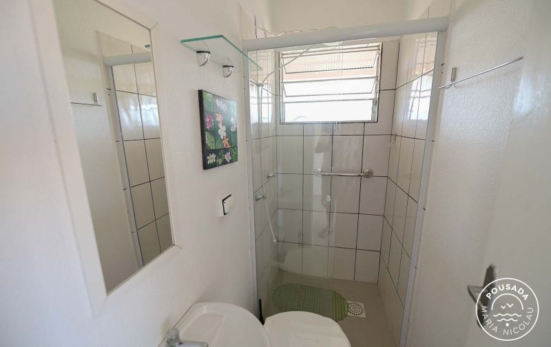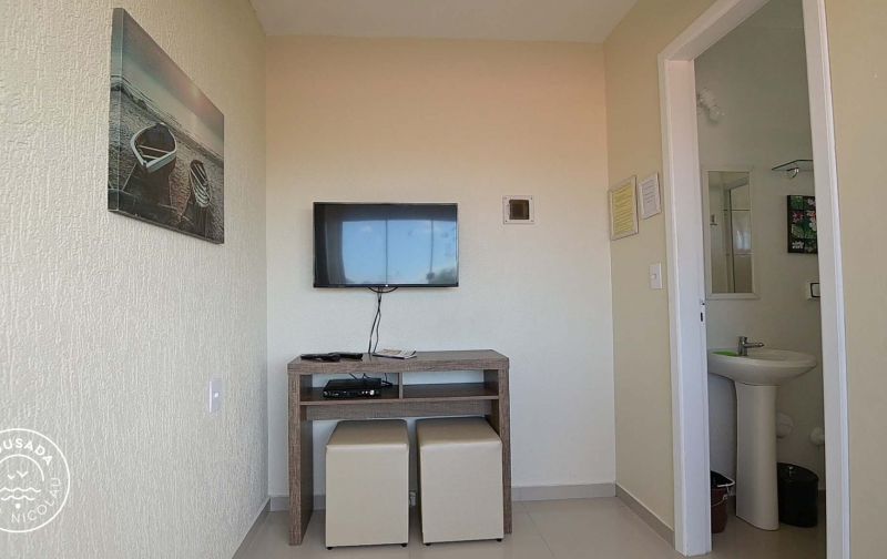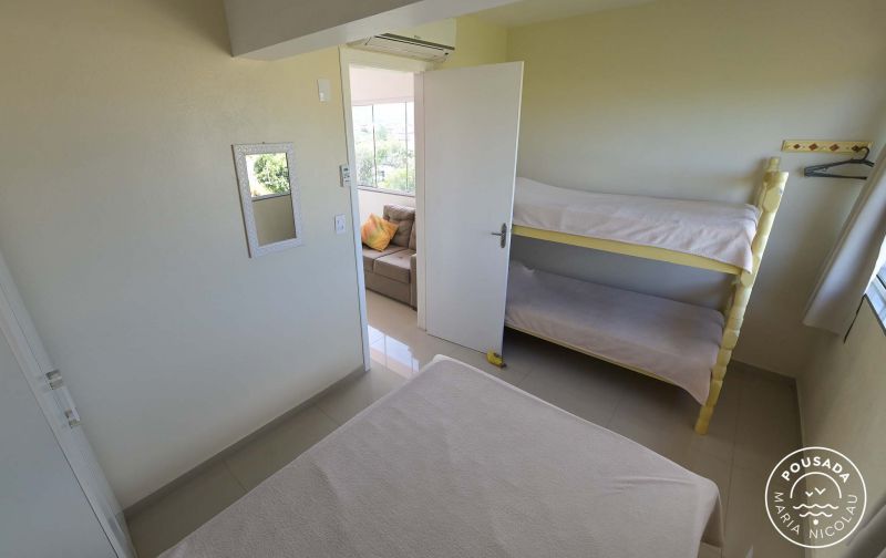 Possui 1 quarto com cama de casal e 1 beliche, com ar condicionado.