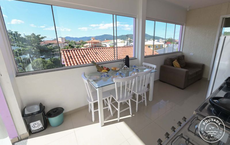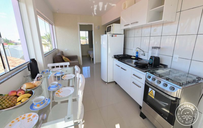 Nossa cozinha é bem equipada, com micro ondas, torradeira elétrica e liquidificador.
