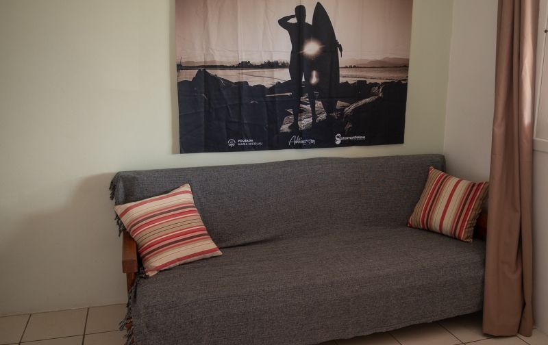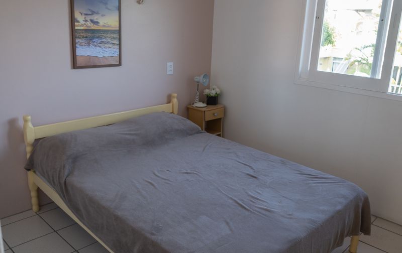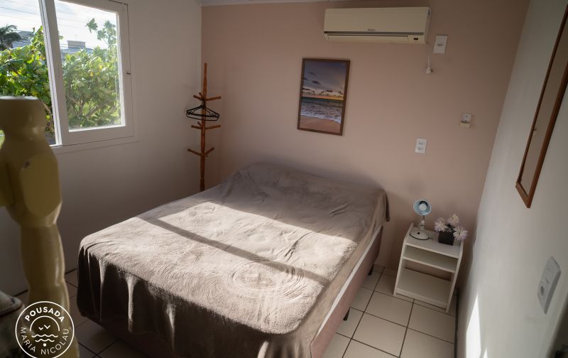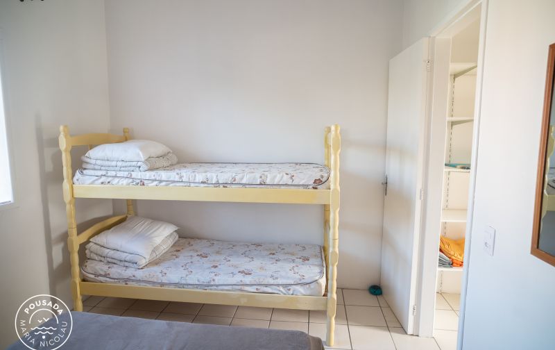 Os dois quartos estão na parte superior, com uma cama de casal e um beliche cada um, com ar condicionado.