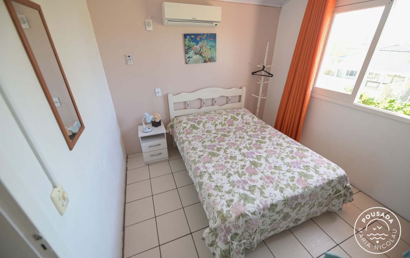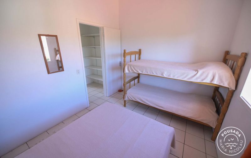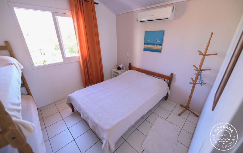 Os dois quartos estão na parte superior, com uma cama de casal e um beliche cada um, com ar condicionado.