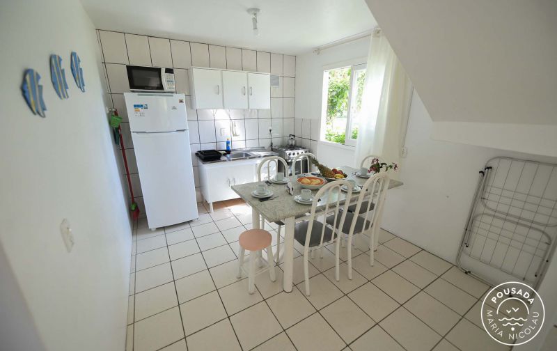 Nossa cozinha é bem equipada, com micro ondas, torradeira elétrica e liquidificador.