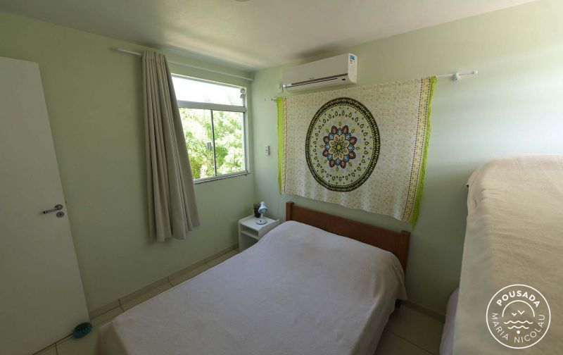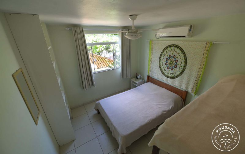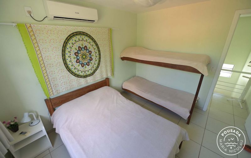 Os dois quartos estão na parte superior, com uma cama de casal e um beliche cada um, com ar condicionado.
