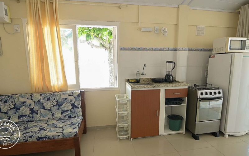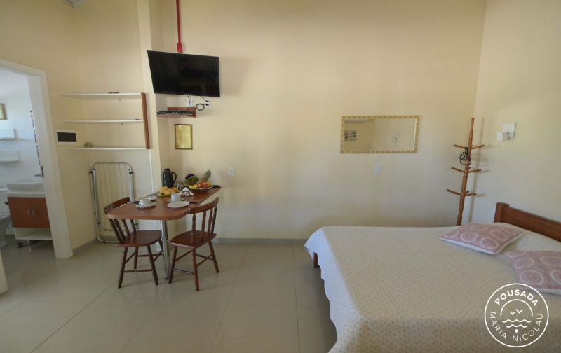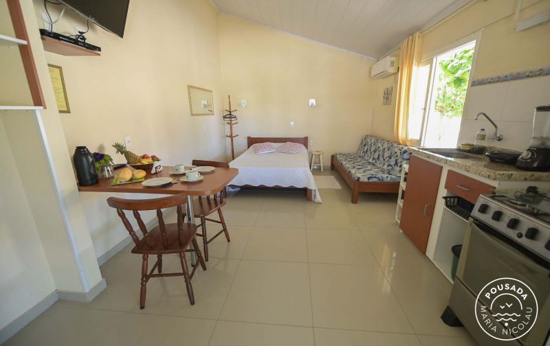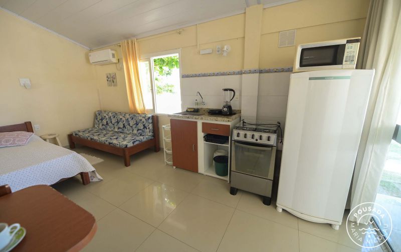 O studio, em um ambiente único, é uma agradável oção térrea para até três pessoas.