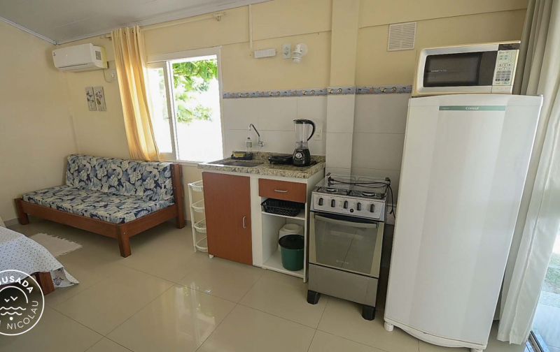 Nossa cozinha é bem equipada, com micro ondas, torradeira elétrica, liquidificador e demais utensílios para você preparar todas as suas refeições.